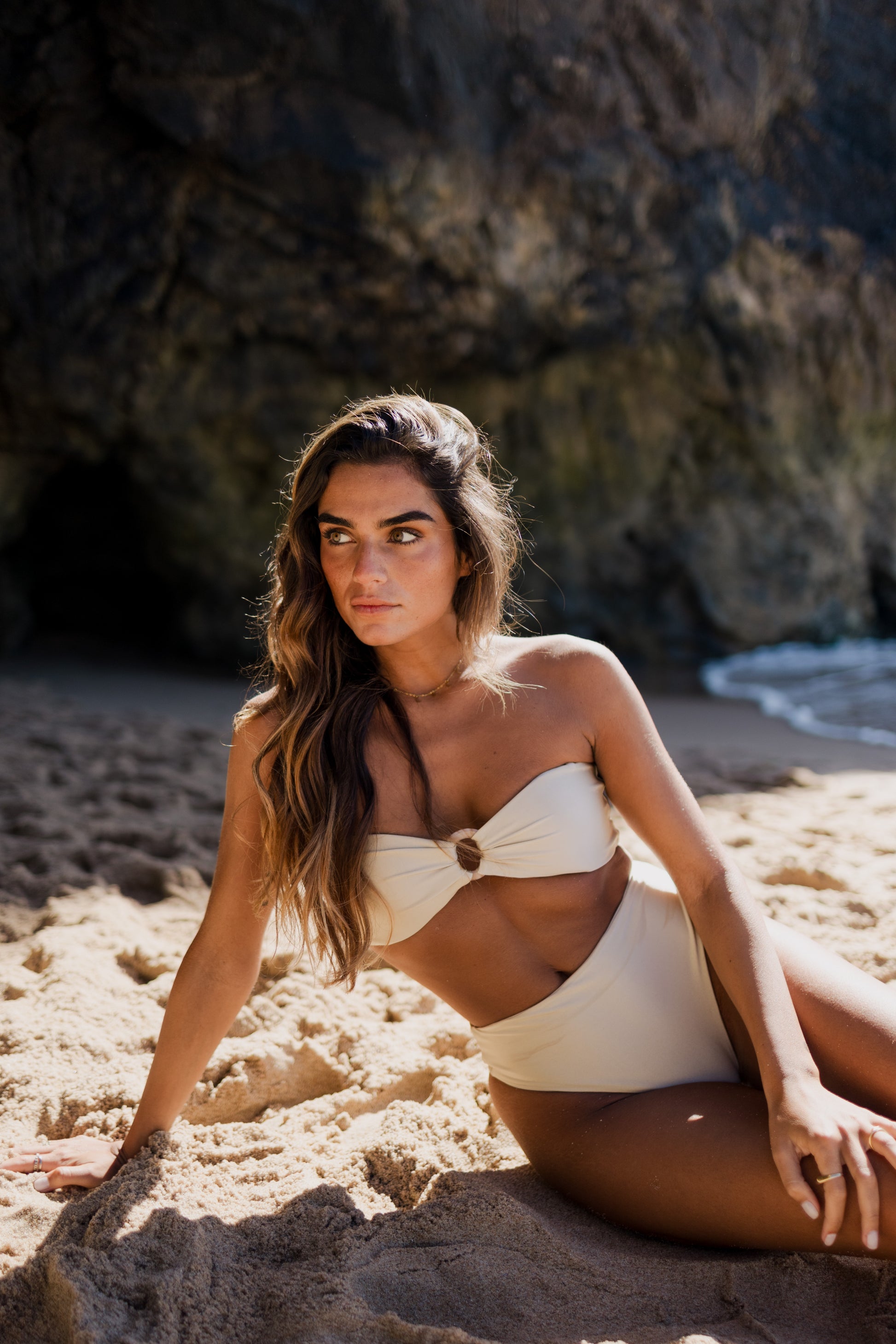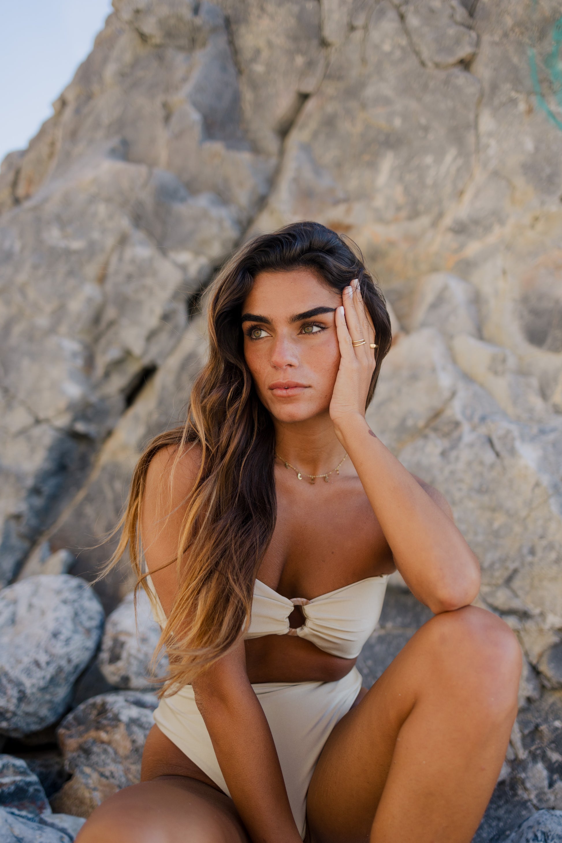Biquíni com argola de cor champanhe, com copas, com abertura para copas. Alças removíveis. Aperta atrás com fecho. Parte de baixo de cintura subida.